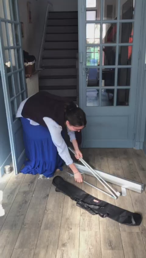 Roll-up Nomade (85×200 cm) : 150 € net Intérieur, structure alu livrée avec sa housse.